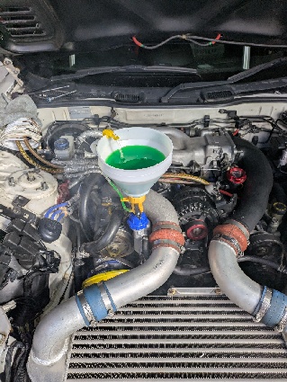 ちなみにFD3Sのエア抜きをする場合、スロットルボディに来ている配管を外し、ホースと配管のどちらからもクーラントが出るまで補充してからエア抜きすると早いです。